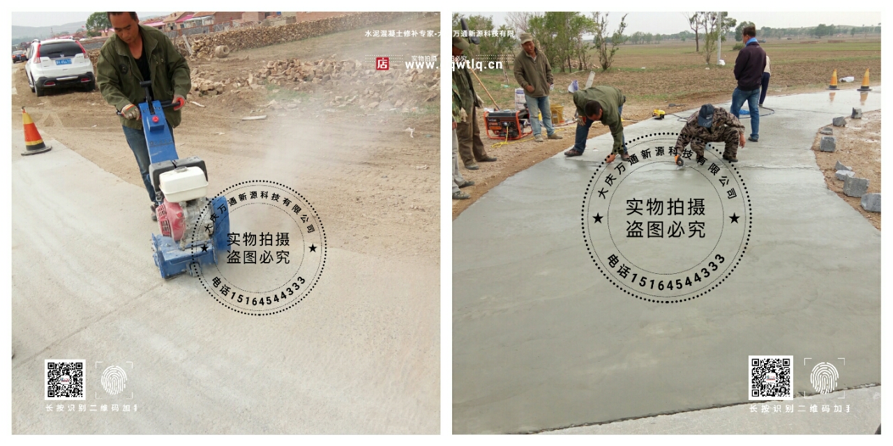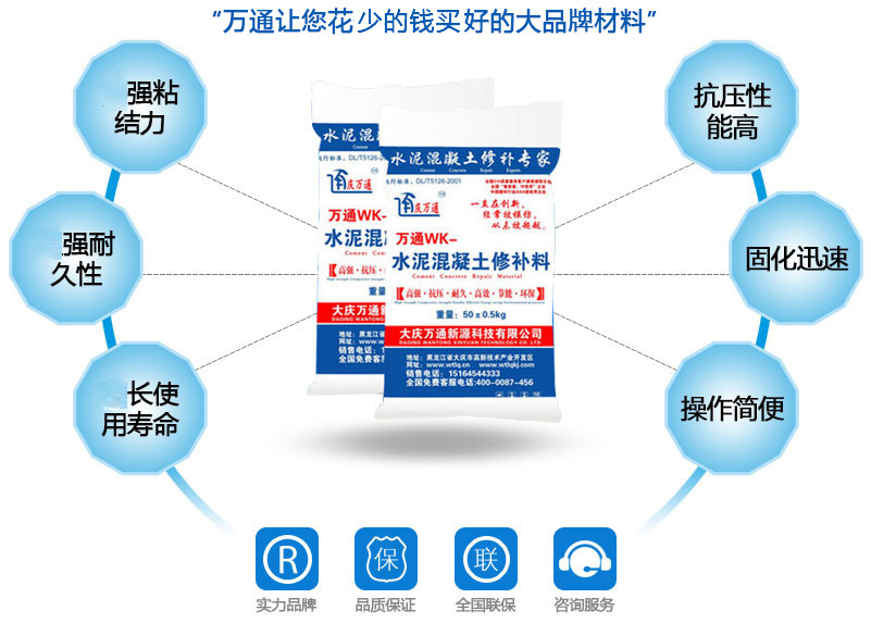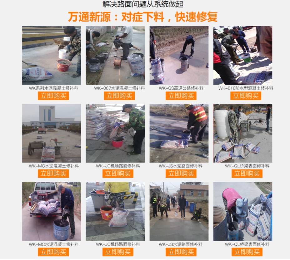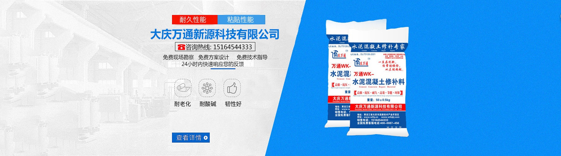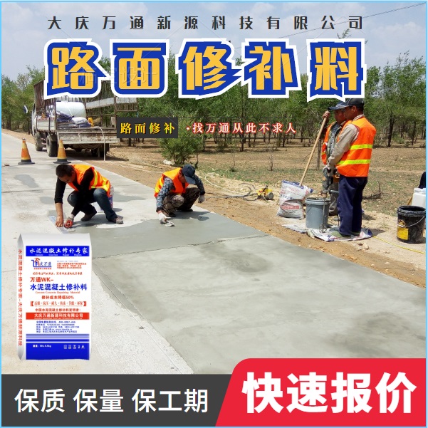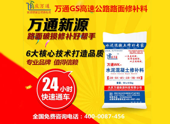 大慶萬通新源科技有限公司獨有的混凝土路面高強速補料,是水泥混凝土路面病害修復的好材料。疲勞、凍融循環(huán)、彎曲壓力、滲水和基層破壞等原因都會引起水泥路面的破損,從而帶來高昂的維護費用。與以往的剛性修補方法不同,混凝土水泥路面維修速補膠提供了一種獨特的柔性修補產(chǎn)品和技術,高柔性、高抗拉性,可跨伸縮縫施工和高抗壓性使得混凝土快補產(chǎn)品為水泥混凝土路面提供了******性的修補。傳統(tǒng)的剛性修補方案,如環(huán)氧砂漿和快干水泥產(chǎn)品,由于其自身的粘結失效,抗疲勞性低以及與原路面不同的伸縮系數(shù),修補面會在短時間內失效或產(chǎn)生新的裂縫,需要反復修補,有效期短且費用高昂。大慶萬通新源科技有限公司的混凝土水泥路面維修速補膠可以隨原路面一起伸縮,移動,從而避免了粘結失效和產(chǎn)生新裂縫。萬通快補產(chǎn)品優(yōu)異的粘結性、柔韌性和高防滑性,特別適用于水泥路面的淺層粘合修補,多邊角混凝土板層修補,跨伸縮縫修補以及路面沉陷修補。萬通混凝土病害修補料針對混凝土起皮起沙、斷板裂縫、蜂窩麻面、坑槽露石子、漏筋掉皮、橋梁的掉皮漏筋快速通車使用時間長。應用萬通快補產(chǎn)品,施工后一天就可以恢復交通。大慶萬通新源科技有限公司的萬通水泥路面維修速補膠適用于高速公路、機場路面、農村村村通路面、廠坪、學校操場、市區(qū)公路、小區(qū)路面、橋梁、水泥路面的修補。使用萬通特快補材料修補路面可以一勞永逸! 水泥地面起砂怎么辦,混凝土修補劑混凝土地面起砂,混凝土地面修補,地面起砂怎么辦,